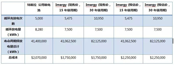 Imergy電力系統(tǒng)公司是一家儲能和共享電力系統(tǒng)的生產(chǎn)商,被稱為能源存儲平臺(ESP),擁有釩氧化還原液流電池等產(chǎn)品。Imergy電力系統(tǒng)公司稱其旗下的電池產(chǎn)品目前單位千瓦時的價格在500美元,未來將削減到300美元左右。以下為預估的特斯拉公用級電池與Imergy公共級電池比較↓↓↓(點擊圖片可放大閱讀)