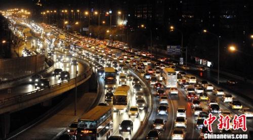 北京北二環(huán)擁堵不堪,車燈形成了一道長(zhǎng)虹。中新社記者 劉震 攝