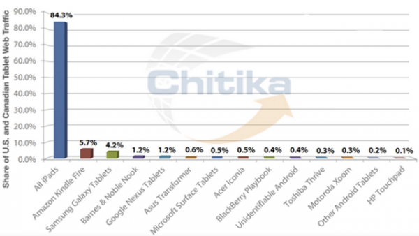 從統(tǒng)計結(jié)果中可以看出,在Chitika的統(tǒng)計范圍之內(nèi),有84.3%的網(wǎng)絡(luò)數(shù)據(jù)流量來自于iPad。相比之下雖然競爭對手三星的平板電腦型號可謂非常之多,但是所占比重僅有4.2%,僅位列第三。雖然對于平板電腦用戶來說,各種應(yīng)用的使用頻率要遠(yuǎn)高于瀏覽網(wǎng)頁,不過這也不足以解釋iPad為何擁有如此巨大的優(yōu)勢。
