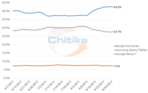 從Chitika對今年6月至8月的數(shù)據(jù)流量的統(tǒng)計來看,iPad依然保持著平板電腦市場的霸主地位。雖然谷歌在今年7月發(fā)布了新一代的Nexus 7平板電腦,但是Android平板在所有網(wǎng)絡(luò)數(shù)據(jù)流量中的比重卻沒有明顯的增長。雖然與iPad的差距很大,但是亞馬遜的Kindle Fire系列平板電腦還是憑借著較高的性價比以5.7%的份額位居次席。