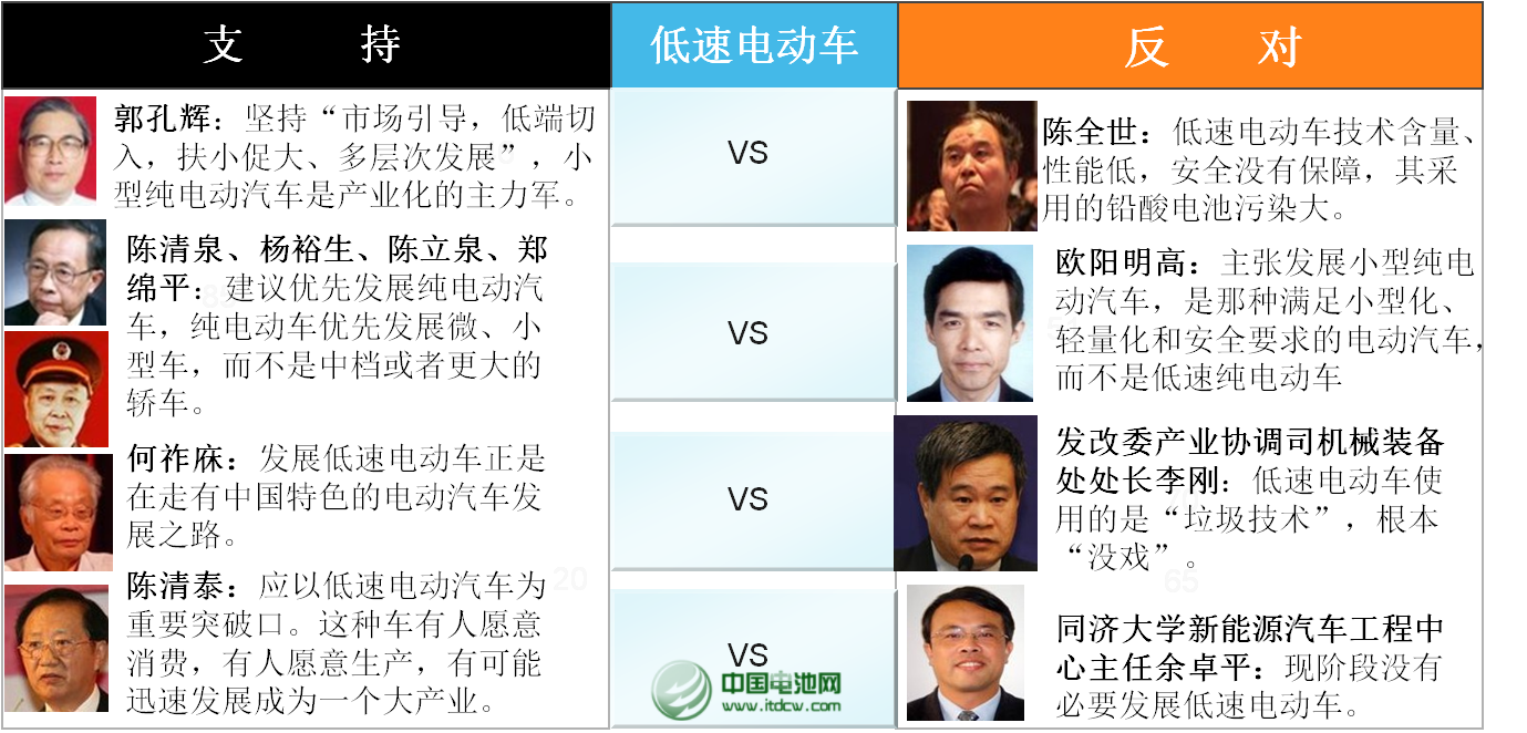 以郭孔輝院士為代表的支持者認(rèn)為中國(guó)應(yīng)當(dāng)堅(jiān)持“市場(chǎng)引導(dǎo)、低端切入、以小促大、多層次發(fā)展”的策略,優(yōu)先發(fā)展低速電動(dòng)汽車(chē)來(lái)帶動(dòng)新能源汽車(chē)發(fā)展。而以陳全世教授為代表的反對(duì)者則認(rèn)為低速車(chē)技術(shù)含量低,安全沒(méi)保障,鉛酸電池污染大,更有部委官員明確表示低速電動(dòng)車(chē)屬于“垃圾技術(shù)”,不適宜大規(guī)模發(fā)展。