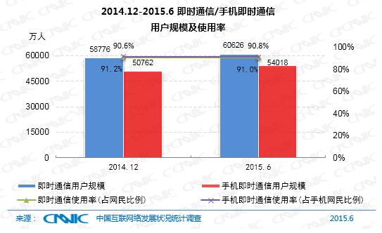 截至2015年6月,網(wǎng)民中即時通信用戶的規(guī)模達到6.06億,較去年底增長了1850萬人,占網(wǎng)民總體的90.8%,其中手機即時通信用戶5.40億,較去年底增長了3256萬人,占手機網(wǎng)民的91%。