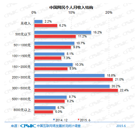 圖9中國網民個人月收入結構 三、接入方式 (一)接入設備 截至2015年6月,我國網民中使用手機上網的比例為88.9%,較2014年底增長了3.1個百分點,繼續保持