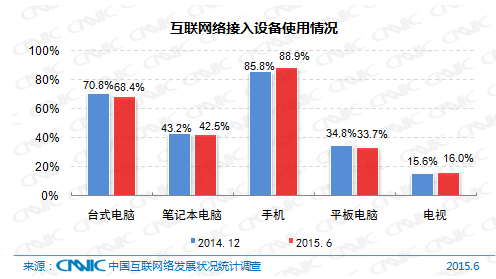 截至2015年6月,我國網民中使用手機上網的比例為88.9%,較2014年底增長了3.1個百分點,繼續保持增長。通過臺式電腦和筆記本電腦接入互聯網的比例分別為68.4%和42.5%,較2014年底分別下降了2.4和0.7個百分點,電腦端向手機端遷移趨勢明顯。此外,我國網民中使用平板電腦上網的比例為33.7%,較2014年底下降了1.1個百分點。手機大屏化以及應用體驗的不斷提升較好滿足了手機網民的娛樂需求,對平板電腦的使用產生一定影響。最后,當前我國網民對網絡電視使用率為16.0%,和2014年12月基本持平。