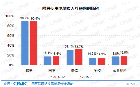 截至2015年6月,我國網民在家里、網吧、學校和公共場所通過電腦接入互聯網的比例與2014年12月基本持平,而在工作單位通過電腦接入互聯網的比例則有所上升,為33.7%。