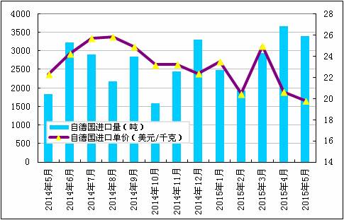 2015年5月份從德國進口多晶硅量減少至3402噸,環比降幅為7.2%;5月份進口單價下滑至19.78美元/千克,環比跌幅為4.1%。