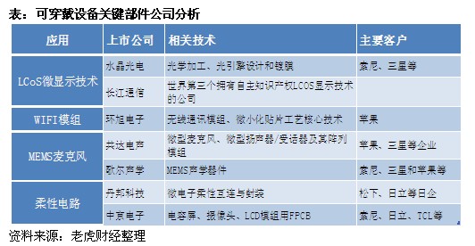 仔細(xì)分析其產(chǎn)業(yè)鏈,事實(shí)上可穿戴設(shè)備需要使用的幾個(gè)關(guān)鍵元器件包括攝像頭、電路板、柔性材料、觸控面板、電池等模組。此外,智能眼鏡+手表的硬件組合也需要兩個(gè)產(chǎn)品之間頻繁的信號(hào)互聯(lián), 勢必增加對(duì)無線模組的需求。