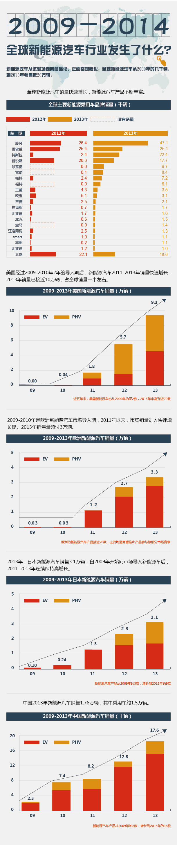新能源汽車從試驗場走向商品化,正面臨規(guī)模化。全球新能源汽車從2009年的幾千輛,到2013年銷售近20萬輛。