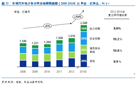 通訊娛樂系統與安全控制系統開始步入增長期。根據德勤報告的數據顯示,預計2012-2016E通訊娛樂系統年復合增長率將達10.8%,為各細分行業中年復合增長率最快,安全控制系統年復合增長率將為10.2%,位居第二。