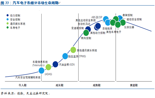 未來市場空間大的是汽車安全駕駛輔助系統、胎壓監測系統TPMS、自動駕駛公路系統等,都處于導入期與成長期。