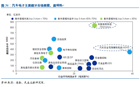 從汽車電子各細分行業的市場規模與盈利性來看,通訊娛樂系統與安全控制系統增長迅速:汽車安全駕駛輔助系統(ADAS)毛利率水平接近40%,2020年市場規模近400億美元;車載信息系統2020年市場規模超800億美元,是汽車電子細分行業中市場規模最大的。