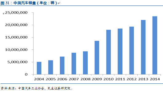 中國已成為汽車產(chǎn)銷第一大國,未來每年超2,000萬輛的產(chǎn)銷規(guī)模為汽車電子發(fā)展提供大空間。過去十余年,中國汽車行業(yè)發(fā)展迅猛,由2000年的208.6萬輛增長至2014年的2348.9萬輛,長期趨勢來看,預(yù)計汽車在中國仍處于汽車消費普及階段、保有量較低、二三四線汽車購買能力顯著提升、城鎮(zhèn)化等內(nèi)生性因素驅(qū)動下,銷量增速仍將維持較高的水平上。
