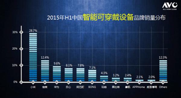 從市場參與品牌來看,2015年上半年中國智能可穿戴設(shè)備品牌銷量,小米排在第一位,占據(jù)28.7%的市場份額;得益于小米去年發(fā)布的智能手環(huán),價格很低,被瘋狂搶購。像華為、三星和蘋果等手機(jī)廠商也積極布局智能可穿戴領(lǐng)域,此外,很多國內(nèi)新興品牌因為資本注入,迅速發(fā)展搶占市場。