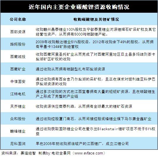 “并購(gòu)”已成為大多數(shù)企業(yè)進(jìn)入碳酸鋰資源的最優(yōu)途徑。從西藏城投、中信國(guó)安、西藏礦業(yè)等企業(yè)布局中國(guó)鹽湖資源到西部資源、路翔股份、眾和股份控制中國(guó)鋰礦石資源,通過(guò)收購(gòu)從而直接或者間接控制資源成為企業(yè)慣用的招數(shù)。