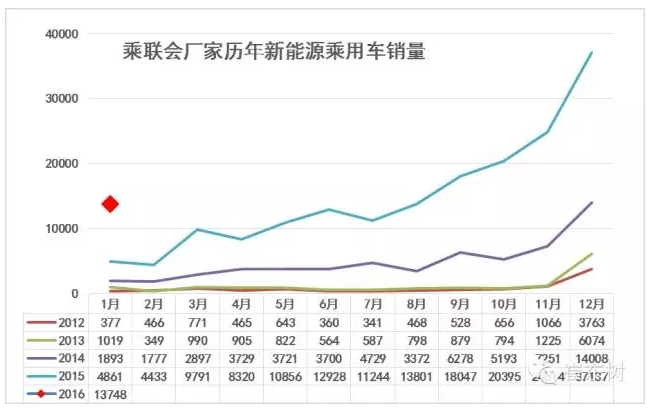1月的新能源車銷量13748臺,同比15年1月的4861臺增長1.8倍,增速仍保持較高水平。歷年的新能源車都是前低后高的加速拉升走勢,15年從8月以來的新能源車銷量進入拉升軌跡,15年年末幾個月都是月度環比暴增,12月更是環比暴增萬臺左右,市場熱度快速升溫。16年1月的降溫是符合正常的走勢特征的。