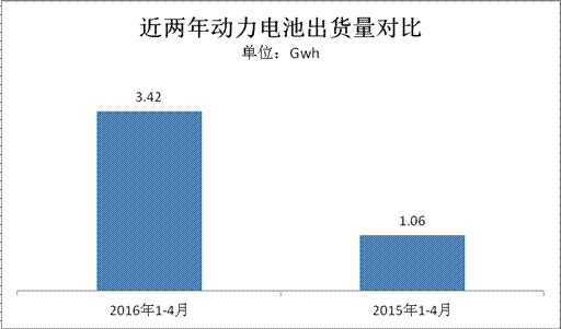 源于政策紅利的引導(dǎo)輔以私人消費信心的培育以及充電基礎(chǔ)設(shè)施等多方面的發(fā)展,新能源汽車市場也逐步走向穩(wěn)增長。據(jù)中汽協(xié)數(shù)據(jù)統(tǒng)計,2016年1-4月新能源汽車產(chǎn)量94442輛,比上年同期增長126.8%。而作為核心零部件的動力電池也跟隨新能源汽車整體市場走向,呈現(xiàn)高增長趨勢。據(jù)第一電動研究院數(shù)據(jù)梳理,2016年1-4月動力電池出貨量達3.42Gwh,較之去年同期1.06wh的出貨量實現(xiàn)同比增長2.38倍。(注釋:以下動力電池數(shù)據(jù)源于新能源汽車產(chǎn)量與其搭載的電池容量乘積。由于未考慮其他影響因素,總體實際產(chǎn)能會略高于此。電池出貨量計算公式:車型搭載電池容量*車型產(chǎn)量。