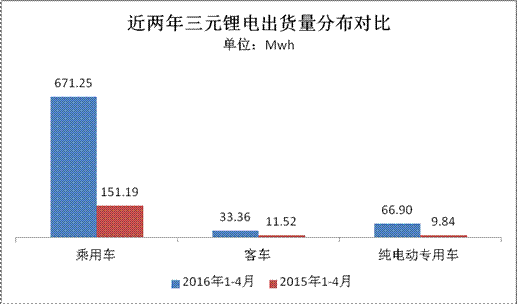 三元鋰電池方面,此前政策要求暫停三元鋰電應(yīng)用于客車領(lǐng)域,但從今年與去年同期出貨量數(shù)據(jù)比較看,這對三元鋰電的總產(chǎn)能并未造成太大影響,與2015年1-4月三元鋰電池出貨量(172.55Mwh)對比,今年實現(xiàn)了3.47倍的同比增幅,凈增量達600Mwh。細分看,三元鋰電在客車領(lǐng)域的變化基本不達,僅增21Mwh左右;對應(yīng)的其產(chǎn)能在乘用車領(lǐng)域的增幅最為明顯,同比增幅達3.44倍,凈增量達520Mwh;其次,三元鋰電在專用車領(lǐng)域的變化也伴隨專用車產(chǎn)量的走勢逐步遞增,電池搭載量增量達57Mwh,增幅達5.7倍。