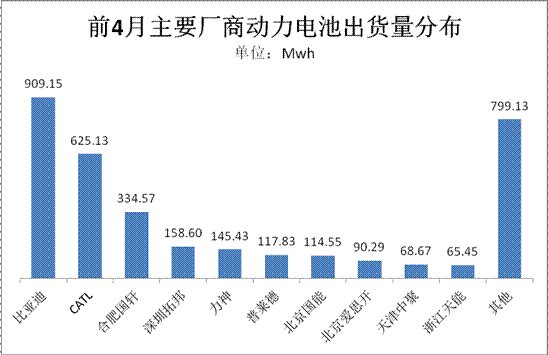 細分動力電池生產(chǎn)廠商看,前4月電池有產(chǎn)量的廠商數(shù)量近90家,其中排名前10位的廠商電池出貨量累計達2.63Gwh,占比高達77%;而出貨量超過100Mwh的廠商數(shù)量僅7家:比亞迪、CATL、國軒高科、深圳拓邦、力神、普萊德、國能,7家電池出貨量累計達2.4Gwh,占比70%。