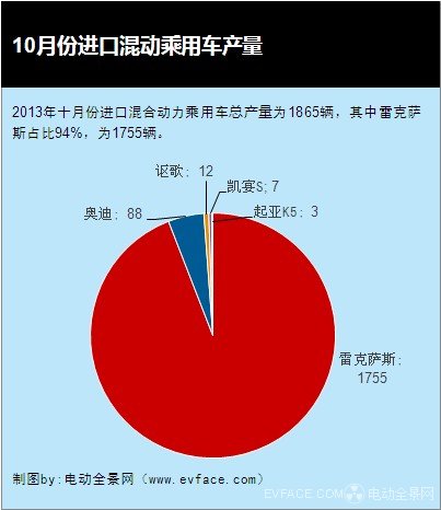 2013年十月份進口混合動力乘用車總產量為1865輛,其中雷克薩斯占比94%,為1755輛。排在第二位的是奧迪牌,為88輛,謳歌、凱宴、起亞加起來不過22輛,雷克薩斯的零頭都不到,只占總產輛的1.2%。