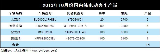 2013年10月份我國國內純電動客車產量有很大減產,僅為14輛,有北京、五洲龍、金龍和安凱四個品牌,其中北京牌5輛,五洲龍和金龍牌各4輛,安凱牌一輛。10月份國內純電動客車產量與9月份1