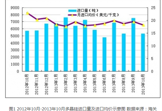 2013年10月份我國多晶硅進(jìn)口呈現(xiàn)量?jī)r(jià)齊跌的態(tài)勢(shì),雖然進(jìn)口量有所減少,但是多晶硅低價(jià)傾銷進(jìn)一步加劇。據(jù)最新海關(guān)統(tǒng)計(jì)數(shù)據(jù)顯示,10月份多晶硅進(jìn)口量為5328噸,環(huán)比大幅減少29.1%;多晶硅進(jìn)口均價(jià)下滑至18.27美元/千克,環(huán)比下降6.7%,同比下滑20.6%。同時(shí),10月份一般貿(mào)易方式進(jìn)口多晶硅為1289噸,在總進(jìn)口量中占比僅為24.2%,加工貿(mào)易等方式進(jìn)口量為4039噸,雖環(huán)比減少32.3%,但在總進(jìn)口量中占比仍高達(dá)75.8%。值得業(yè)內(nèi)關(guān)注的是,國外規(guī)避“雙反”又出新招——轉(zhuǎn)口臺(tái)灣,10月份從臺(tái)灣進(jìn)口多晶硅達(dá)623噸,占總進(jìn)口量的11.7%。