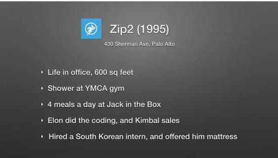 Musk 從默默無聞到聲名鵲起,是從和他一起來到美國的兄弟 Kimbal 合作開始的。他們一起開了第一家網(wǎng)絡(luò)公司 Zip2,一個幫助傳統(tǒng)媒體把內(nèi)容和信息發(fā)布到互聯(lián)網(wǎng)上的平臺,其中包含黃頁和白頁功能,目標(biāo)是幫助全國性的網(wǎng)絡(luò)媒體與地方商家合作,將產(chǎn)品地方化。因為預(yù)算很緊,Musk 和 Kimbal 及另一位朋友合租了一套公寓,就在公寓里辦公和睡覺,需要洗澡就去教會。作為首席程序員,Musk 不分晝夜地坐在電腦前工作。