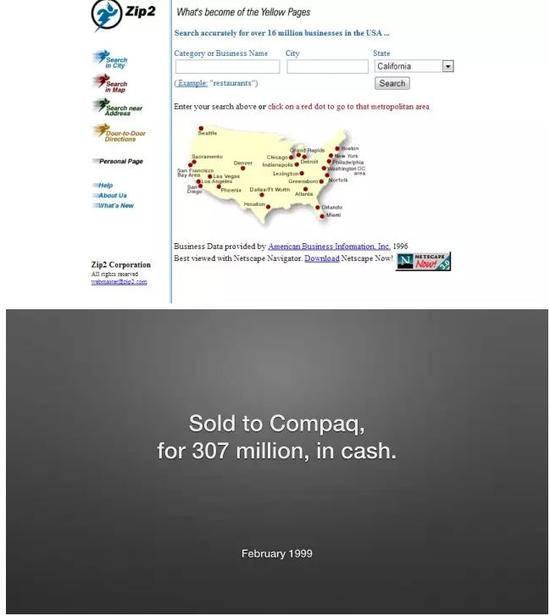 1999 年,康柏以 3.07 億美元收購了 ZIP2,也讓當(dāng)時年僅 27 歲的 Musk 賺到了2200萬美金。