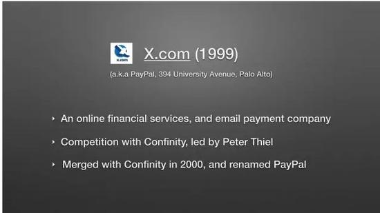 在 X.com 辦公的同一棟樓里,還有另一家叫 Confinity 的互聯(lián)網(wǎng)金融公司,創(chuàng)始人是如今大名鼎鼎的彼得·泰爾(Peter Thiel)和 Max Levchin。X.com 擁有快捷轉(zhuǎn)賬服務(wù),后來 Confinity 也決定開發(fā)類似服務(wù)。兩家公司都開始注意到快捷轉(zhuǎn)賬服務(wù)的市場需求很大,這也使兩家公司之間的競爭愈發(fā)激烈,最終他們決定合并成一個公司,就是我們今天所熟知的 PayPal。