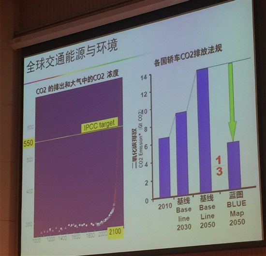 前陣子,長安的徐留平董事長我們交流了半天時間,我沒想用這張PPT,他居然提到了碳排放這個問題,今天大家一看都是產業界的,在座的大部分是做管理相關的,不是做技術的,相信大家會關注這個問題。二氧化碳在大氣中的濃度,IPCC(政府間氣候變化專門委員會)的目標是550個PPM,中國在巴黎峰會已經非常積極地促成了巴黎峰會協議的達成。2050年我們減排2/3,這個目標是非常艱巨的。