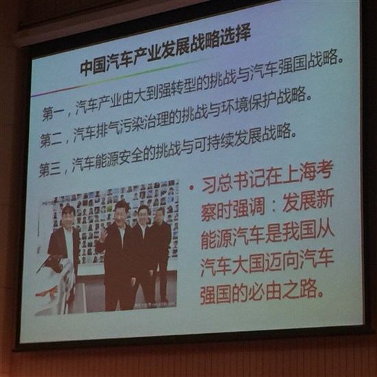 中國為什么選擇發展新能源汽車?我想有幾個戰略意圖,有為了應對能源安全挑戰的可持續戰略,有環保戰略,有提升產業競爭力的強國戰略。但我想,中國強國戰略估計還是排在第一位的,其實這三個戰略各個國家的排序都不太一樣,同時各個國家也在變化。比如美國最開始是能源安全是第一位的,但是現在也慢慢也轉成產業競爭力第一位,歐盟一貫是以低碳發展做為第一目標,其實低碳發展目標里面隱含了產業技術競爭力的目標。實際上三個目標雖然是三個戰略,但是有優先級,一個為優先級其它兩個包含其中,戰略是這樣構成的。所謂戰略是道德的制高點和利益訴求的一種統一,一定會有國家利益的選擇在里面。那么中國的選擇是這樣,我想習總書記已經說得非常清楚了,我不在這兒詳細說了。