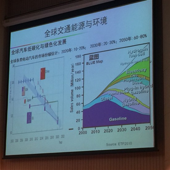 這是全球的環境,三種燃料中常規的石油燃料、氫、電三種動力適用于三種范圍。行駛里程相對短、相對小的范圍中,電動占優勢;中間混合動力、插電式混合動力相對占優;在大型車長距離行駛中,能量消耗特別大的,可能是燃料電池、氫燃料電池會占優勢,這部分以前是柴油機作為動力的范圍。這是一個總的情況。