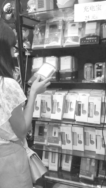 記者看到解放西路一家主營小飾品的小店在銷售各種移動電源。和專賣店相比,這里的移動電源價格較便宜,店家打出“移動電源,25元起”的促銷牌。記者拿起一標(biāo)價38元的移動電源,包裝上都是英文。