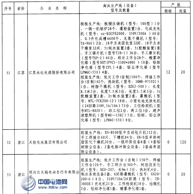 中國電池雜志-中國電池網9月17日訊(肖何 北京報道)工信部網站發布2013年第46號公告2013年第三批工業行業淘汰落后產能企業名單,鉛蓄電池行業有11家赫然上榜,分別是張家口保勝新能源科技有限公司、宿遷博遠電源科技有限公司、宿遷雷克電源有限公司、江蘇永達電源股份有限公司、天能電池集團有限公司、紹興白天鵝電動自行車有限公司、泗縣惠豐電源有限公司、江西省華輝電源科技有限公司、萍鄉市強鑫蓄電池有限公司、駱駝集團股份有限公司、福建省閩華電源股份有限公司(安溪縣),其中極板生產線(設備)629條,組裝生產線(設備)311條。