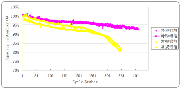 由于特種鋁箔具有較好的物理性能,使得電池的循環性能得到顯著改善。