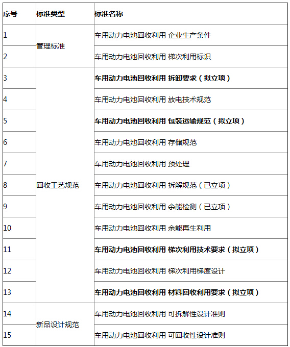 另外,針對(duì)車用動(dòng)力電池回收,我國(guó)將發(fā)布一系列標(biāo)準(zhǔn),從而建立相關(guān)標(biāo)準(zhǔn)的體系(見(jiàn)下表),全力保障動(dòng)力電池的回收和利用,解決電動(dòng)汽車使用的后顧之憂。