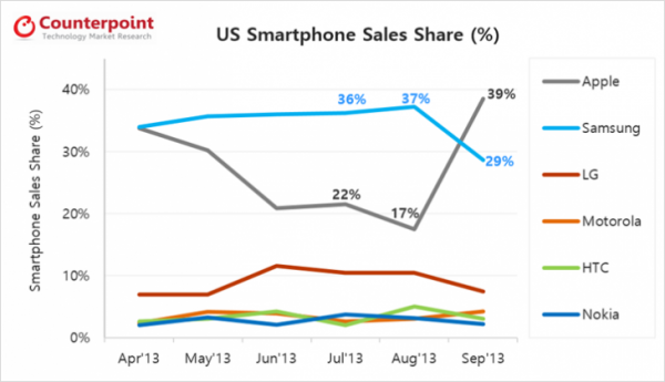 根據Counterpoint Research最新公布的數據,iPhone 5s的強勁市場需求量讓蘋果成功取代了三星,成為了美國9月份智能手機市場銷量第一的手機。據悉,蘋果9月銷售份額達到了39%,三星曾下跌到了29%。