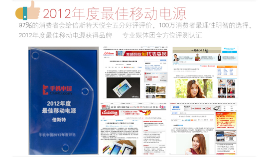 在移動電源行業沒有國家標準和行業標準的指引下,倍斯特率先進行了企業標準的起草和制定。在高標準嚴要求的規則下進行工商管理部門的認證,成為移動電源行業首家企業標準的認證備案品牌。最嚴格的質量標準方能帶來最高質量的產品,倍斯特移動電源以超高的水準贏得“2012年度中國最佳移動電源“獲得品牌,多家專業媒體進行全方位評測認證。