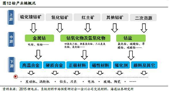 鈷是世界上最重要的戰略礦產之一,是三元電池正極材料中的關鍵元素,由于其在三元鋰離子電池和航空航天耐高溫合金的應用,未來發展前景不可限量。受益于國內外新能源汽車高速增長,未來三元動力電池用鈷需求將大幅增長。據業內專家介紹,鈷的供需平衡將在 2016 年起開始逐漸改善出現小幅短缺,預計到 2017 年供需缺口擴大到 4000 噸-5000 噸的水平,未來鈷價將逐漸企穩回升。