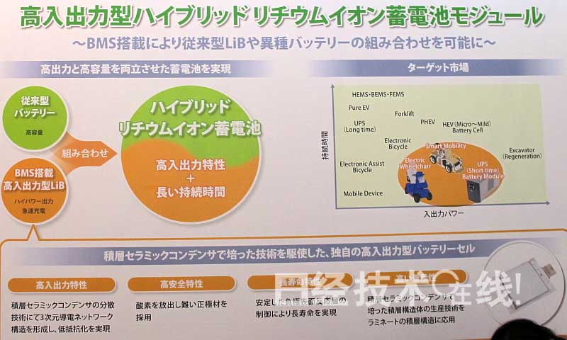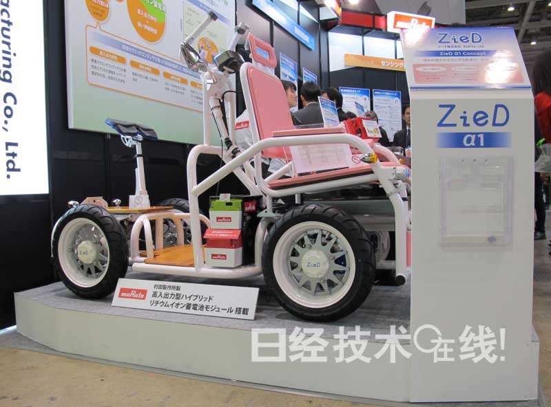 村田制作所在“第6屆日本國際汽車電子技術展”(2014年1月15日~17日,東京有明國際會展中心)上,展示了配備該公司正在開發的高輸出功率鋰離子電池的超小型交通工具。所款電池可實現最大100A的放電,用6分鐘就能充電90%。壽命方面,在常溫下每天充放電一次的話,能使用10年。