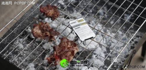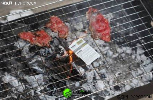 大約6分30秒左右的時(shí)候,烤肉已經(jīng)焦糊,而KINGMAX電池的包裝外皮開始融化,電池也開始出現(xiàn)微微膨脹現(xiàn)象,證明其內(nèi)部已經(jīng)開始充滿化學(xué)氣體。這時(shí)全體人員的心也隨著電池的膨脹開始糾結(jié)起來,一方面隨時(shí)準(zhǔn)備接受可能來臨的“砰聲一響”并隨時(shí)躲避可能出現(xiàn)的“彈片四射”;一方面又有些期待能看到爆炸的震撼場面。