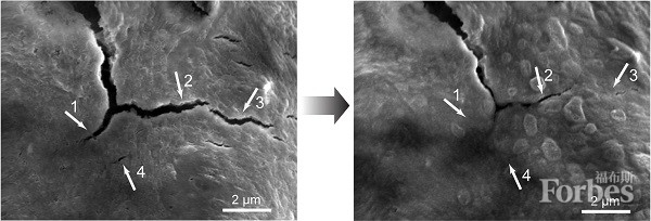 大家可以通過下面的照片,觀察這一過程在電子顯微鏡下的表現。在左圖中,硅電極出現了裂縫;但幾小時后,其中幾條裂縫就已經愈合。