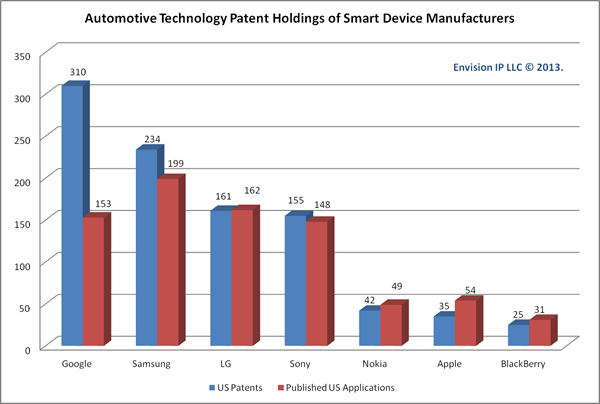 根據(jù)專業(yè)機構Envision-IP分析統(tǒng)計,目前谷歌、三星電子、LG電子、索尼、諾基亞、蘋果和黑莓都已經獲得了大量和汽車有關的專利,顯示在智能汽車和混合/電動汽車的發(fā)展中,科技公司可能已經超越汽車廠商成為主角。