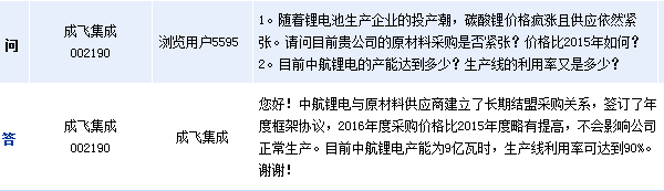 成飛集成表示,中航鋰電與原材料供應(yīng)商建立了長(zhǎng)期結(jié)盟采購(gòu)關(guān)系,簽訂了年度框架協(xié)議,2016年度采購(gòu)價(jià)格比2015年度略有提高,不會(huì)影響公司正常生產(chǎn)。