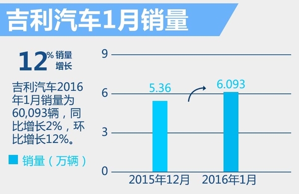 近日,網通社從吉利汽車官方獲悉:今年一月,吉利累計銷售整車60,093輛,同比增長2%,環比增長12%,終端銷量也突破60,000輛。接下來,吉利將進入到新車密集投放期,到今年年底前將至少推出5款全新車型。
