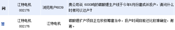 江特電機(jī)(002176)周三在全景網(wǎng)互動(dòng)平臺(tái)表示,公司6000噸的碳酸鋰擴(kuò)產(chǎn)項(xiàng)目正在積極籌建當(dāng)中。