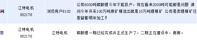 江特電機還表示,碳酸鋰一期已經(jīng)完成并正式生產(chǎn)了,二期正在建設(shè)中。