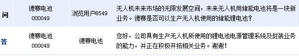 德賽電池(000049)周四在全景網互動平臺上表示,公司具有生產無人機所使用的鋰電池電源管理系統及封裝業務的能力,并正在積極開拓相關業務。