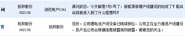 拓邦股份(002139)周五在全景網(wǎng)互動(dòng)平臺(tái)向投資者表示,公司鋰電池產(chǎn)線設(shè)備已陸續(xù)到位,公司正在全力推進(jìn)產(chǎn)線建設(shè),投產(chǎn)后公司會(huì)根據(jù)信息披露規(guī)則披露。