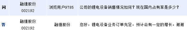 融捷股份(002192)周一在全景網互動平臺上表示,公司的鋰電設備業務訂單充足,預計會有一定的增長。