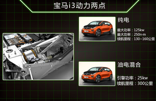 在動力上寶馬i3將分為純電動版以及油電混合版,在純電動版本中寶馬i3配備了一臺功率最大功率125kw,最大扭矩250nm的電動機(jī),讓寶馬i3百公里加速僅為7.2秒,續(xù)航里程在130公里~160公里之間,而帶有雙缸引擎的寶馬i3則最大續(xù)航里程則會超過300公里。